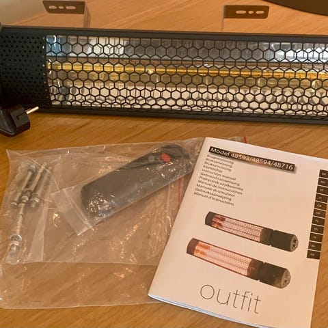 Ny terrasseovn i eske. Nypris kr 1699, har ikke kvittering lenger. Ovn for vegg 1500 watt med fjernbetjening og innebygd LED-LYS