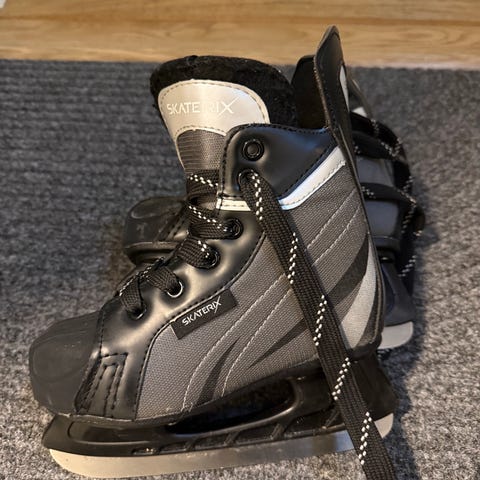 Super Mario Ishockeyskøyter i størrelse 32 for barn. Skøytene er svarte med hvite lisser og har en solid konstruksjon tilpasset ishockey.