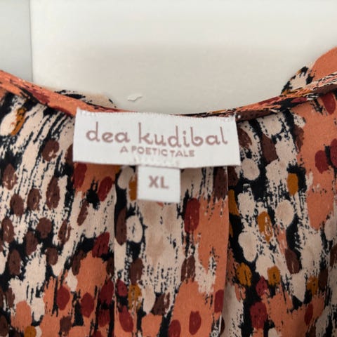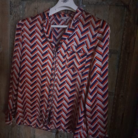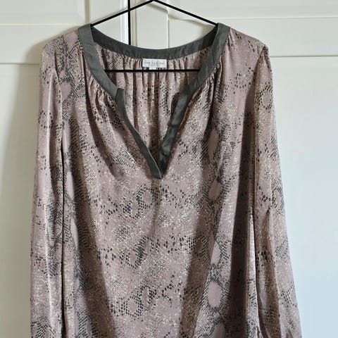 Blusen er pent brukt og i god stand. Som silkeplagg ofte får, har den noen svake dragninger i stoffet, men på grunn av det detaljerte mønsteret er dette lite synlig når den er på.
