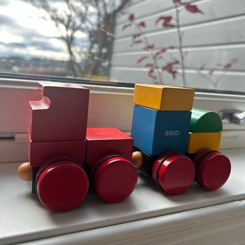 BRIO trelekedyr på hjul i fargene svart med røde hjul og gul detaljer, samt rødt med grønne hjul og gul detaljer. Leken er laget av tre og har en enkel design med hjul som gjør den lett å dra med. Egnet for barn.