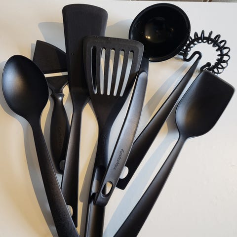 Diverse kjøkkenredskaper: stekespade, visp, serveringsskje
