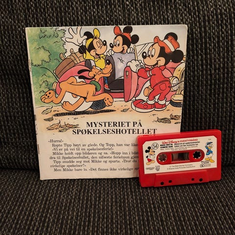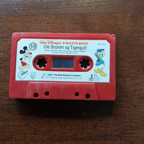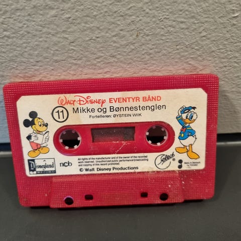 Walt Disney's Jungelboken kassett i rød farge med illustrasjoner av Disney-figurer. Kassettbånd for avspilling av lydinnhold relatert til Jungelboken.