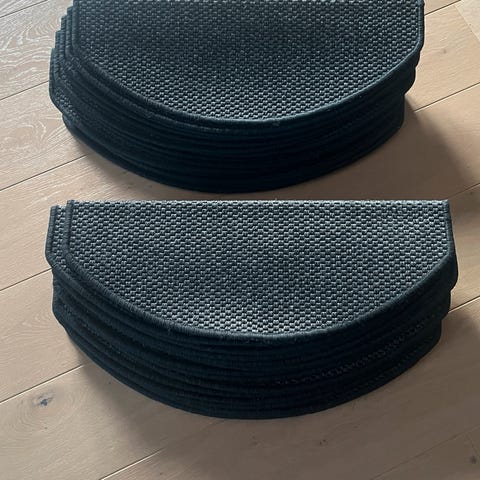 Høykvalitets teppefliser som vi har brukt en gang i en en messe. Passer like godt hjemme eller på kontoret. Det er 20 stk (5 kvadrat) i hver pakke. Har en pakke med de stripete. Har to pakker med de ensfargede. Alle er like høye og kan legges i kombinasjon/mønster. Prisen er per flis (50*50 cm). Deler ikke opp pakkene. Dvs kr 500 per pakke. Ingen pruting. Dette er dyre fliser. Må hentes / møtes i Lørenskog.