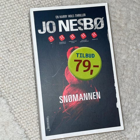 Jo Nesbø Snømannen bok. Inneholder historien om Snømannen, skrevet av Jo Nesbø. Boken er på norsk og utgitt av Aschehoug. Passer for lesere som er interessert i krim og spenningslitteratur.