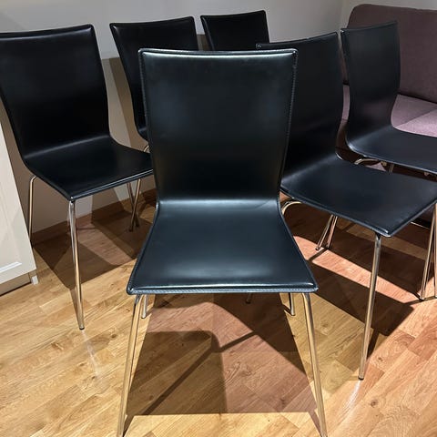 Fire spisestoler med svart formstøpt sete og fastmontert pute i imitert skinn. Matchende ben i stål.