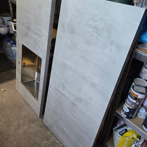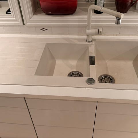 Franke dobbel kum (underlimt vask, 50 x 48 cm) i rustfritt stål med to separate vasker, for kjøkkenbenk, med avløpsåpninger i begge kummer. Overflate i rustfritt stål som er slitesterkt og enkelt å rengjøre. Vasken og kranen er pent brukt, ellers ingen skader. Vasken sitter i resten av benkeplaten siden den er limt under. Grohe Armatur følger med, med fleksislanger. Selges samlet.