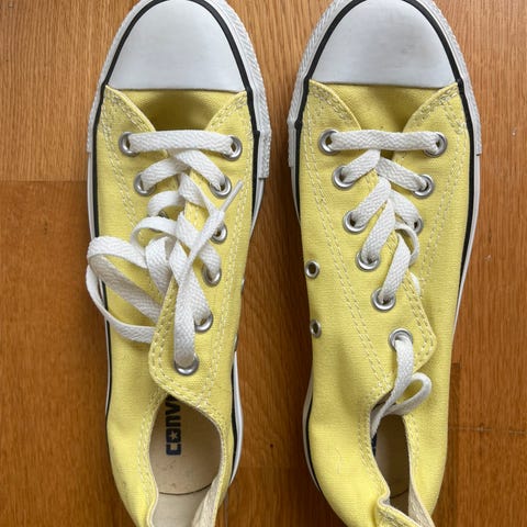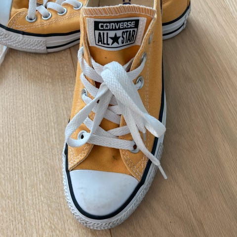 Converse i størrelse 39. Fargen kalles vell fersken, disse er ubrukt, men har fått noe skitt på seg når det har ligget sammen med brukte sko til oppbevaring.