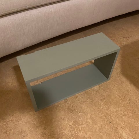 Praktisk vegghylle. Skrues opp på vegg. Har stått på vaskerom. Gira vekk da den har noen malingsflekker (se bilde). Men vil ikke synes om den monteres litt høyt da flekker er på oppside av skap.