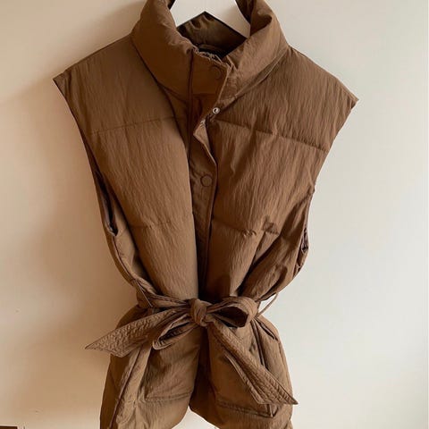 God og varm vest, brukt kun en gang. Hetten har glidelås og kan tas av.