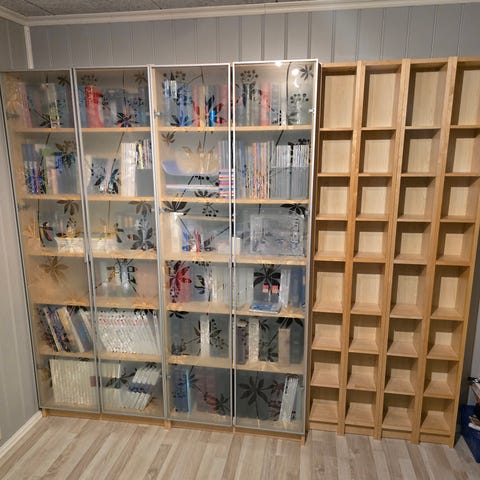 To bokhyller, hver seksjon delt i to. Kjenner ikke til produsenten. Begge skapene har 4 hyller til å feste på ønsket sted, se bilder. Må hentes
