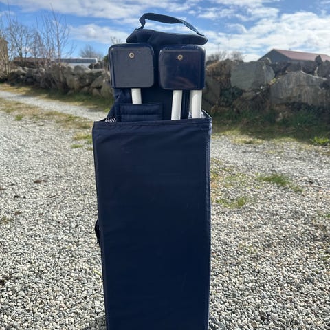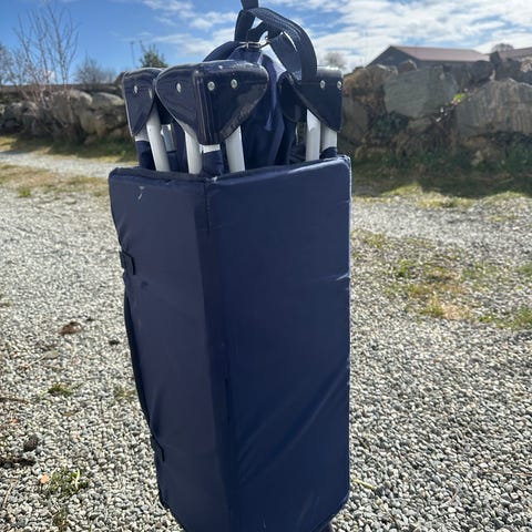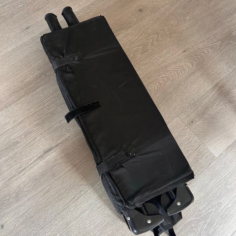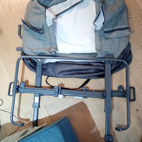 Solid sammenleggbar reiseseng med bunnmadrass. Lite brukt, men et par hull på den ene langsiden. Vi har brukt vattepper i tillegg i bunnen for komfort.