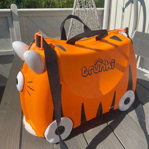 Trunki blå barnekoffert med hjul, bærehåndtak og skulderrem. Kofferten har en hard plastkropp med fargerike detaljer og er designet for barn. Den har innvendige stropper for å sikre innholdet under transport.