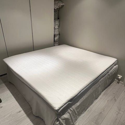 Svært lite brukt IKEA seng med overmadrass, fremstår som ny