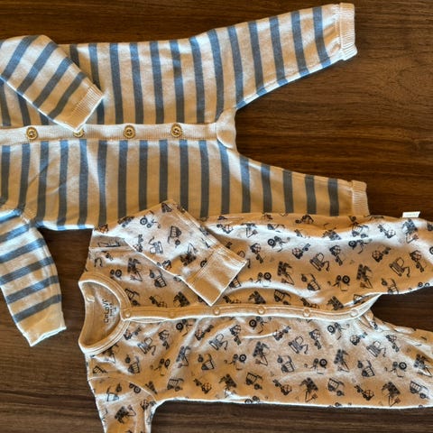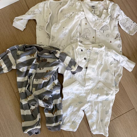 Selger 4 pent brukte pysjer i str. 62. Alle pysjene har fot, en har glidelås og resten har trykknapper. Merker er KappAhl og Name It.