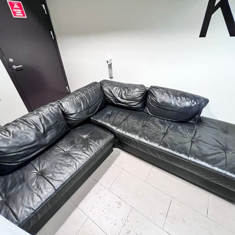 Eldre sofa, godt brukt, kloremerker på ene armlenet.