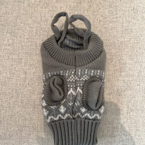 Strikket hundegenser i grå farge med hvitt mønster. Genseren har ribbestrikket kant nederst og ved halsen. Designet inkluderer åpninger for forben. Passer til hunder som trenger ekstra varme.størrelse 27x15 cm fra dogman