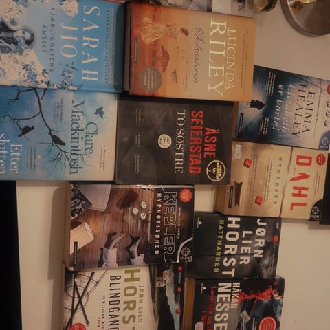 Selger et fint sett med bøker av Jo Nesbø, både krim og sakprosa.