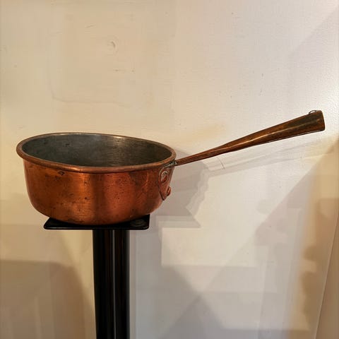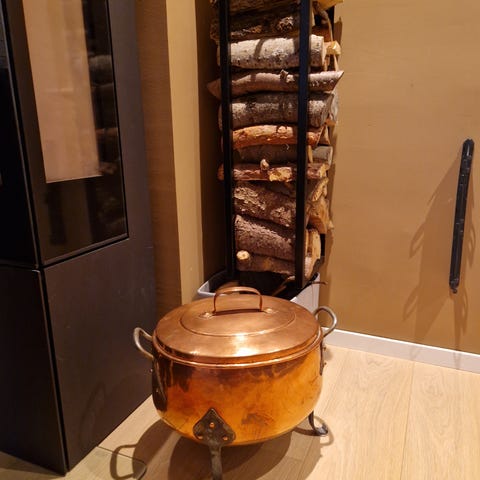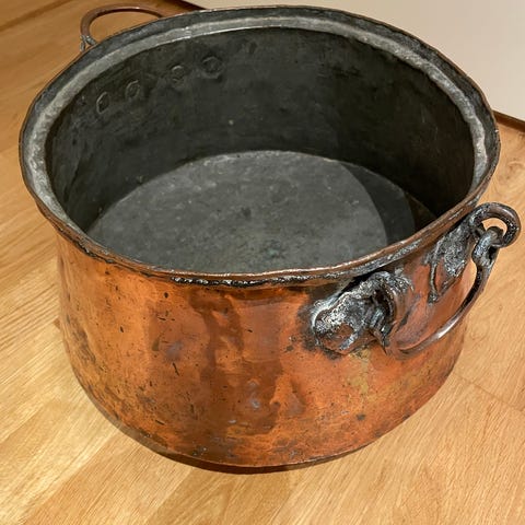 kobbergryte, kobberkjele, antikk kobber, håndbanket, vintage, skandinavisk kobber, fransk stil, restaurantdekor, interiør, samlerobjekt