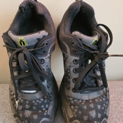 Asics piggsko til løping eller gåtur på vinterføre. Goretex, så skoene er vanntett. Slitt hæl er lappet med selvklebende reperasjonslapp. Dersom disse må byttes fås de kjøpt på f.eks. Clas Ohlson. En pigg mangler. Synes fremdeles skoen fungerer fint til både løping og gåing.