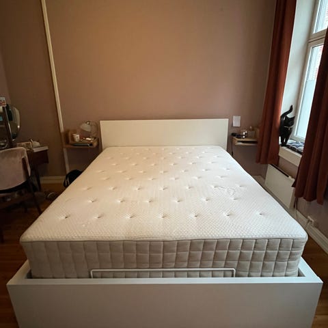 IKEA sengeramme med stofftrukket ramme og ben i metall. Passer til soverom og tilbyr en enkel og funksjonell løsning for sengeplass.