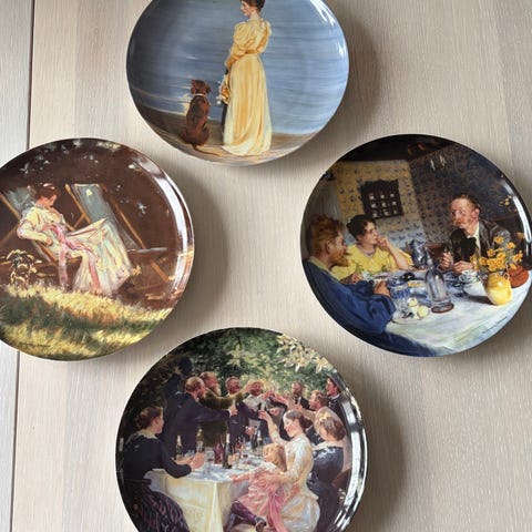 Bing & Grøndahl dekorasjonsfat med illustrasjoner av barn og tekstene "Mor huskes med kjærlighet" og "Kjærlighet må deles". Fatene er laget av porselen og har oppheng for veggmontering. De er dekorative gjenstander som kan brukes til veggdekorasjon.