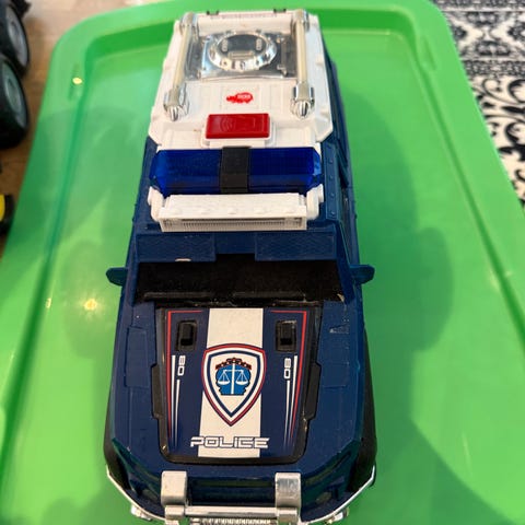 Morsom lekebil for de små bilentusiastene. Har ikke fått lyd og lys til å fungere. Men likevel en morsom bil å leke med. Noe slitte klistremerker (se bilde). Er også et bilde med en skrutrekker ved siden av for å gi en formening om bilens størrelse.