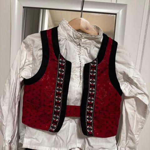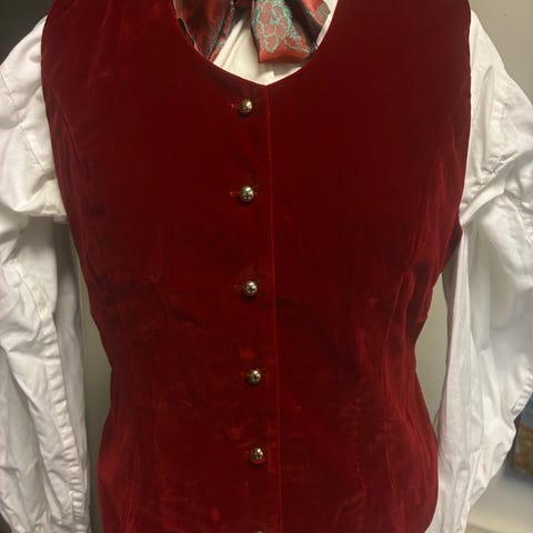 Damebluse med nydelig blondekrage og separat vest som tilhører. Str 38. Pyntebånd på armene.