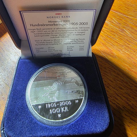 Myntbrev nr 71 med 100 Kr Sølv 33,6 gr 925 S