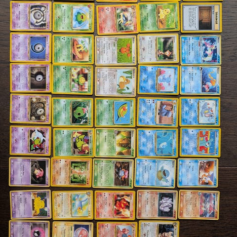 Blandet utvalg av Pokémon samlekort med ulike motiver og typer. Kortene er i forskjellige farger og design. Egnet for samlere og spillere av Pokémon kortspill.