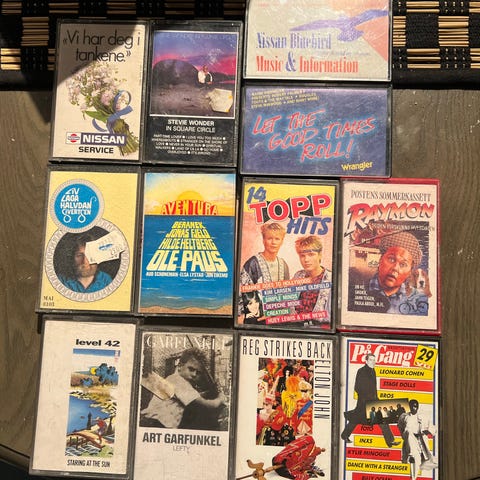 Samling av musikk kassetter oppbevart i en grønn plastboks. Kassettene inkluderer ulike artister , og boksen har plass til flere kassetter. Egnet for lagring og organisering av musikk.