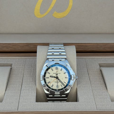 Klokken er komplett med original boks og papirer, og fremstår som pen og velholdt. Det er selvfølgelig hairlines og noen skraper som vist på siste bildet. Den leveres i dag på Rubber B gummirem i sort med grønn stripe, som kler modellen svært godt.