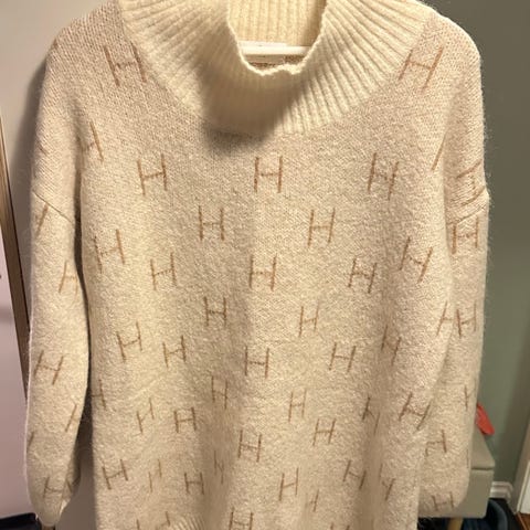 HÉST høyhalset genser i størrelse XS for kvinner. Genseren er hvit og laget av ull. Den har et mønster med bokstaven H over hele plagget. -SOLGT