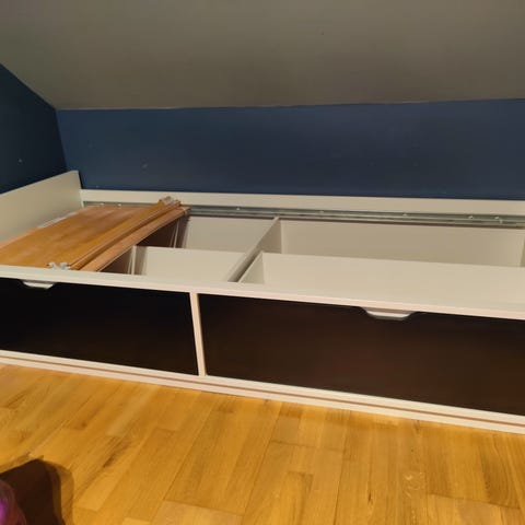 God oppbevaring i skuff under sengen.