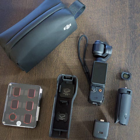 DJI Osmo Pocket-kamera selges med tilbehør, inkludert stativ, mikrofon, ekstra batteri, lader og oppbevaringsetui. Kameraet er kompakt og lett å ta med seg, og egner seg godt til både videoopptak og fotografering i ulike situasjoner. Det medfølgende tilbehøret gir god stabilisering og gjør kameraet enkelt å bruke under opptak.