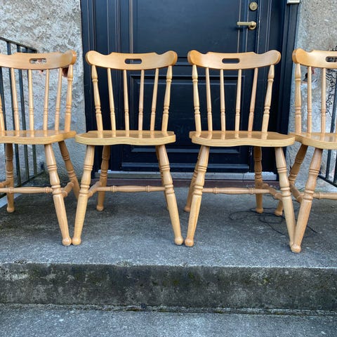 Pinne - kjøkkenstolar brunbeisa bøk frå Sandvik møbelfabrikk.