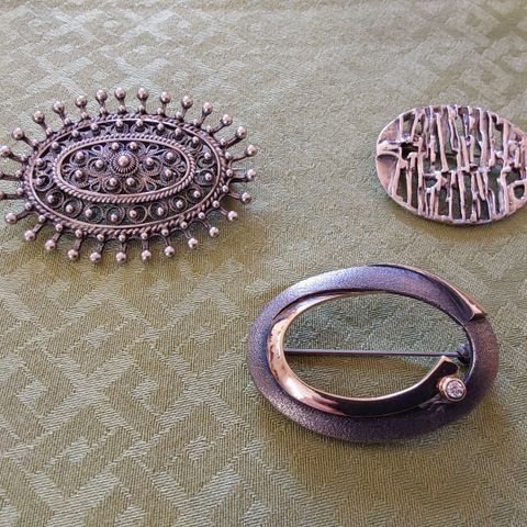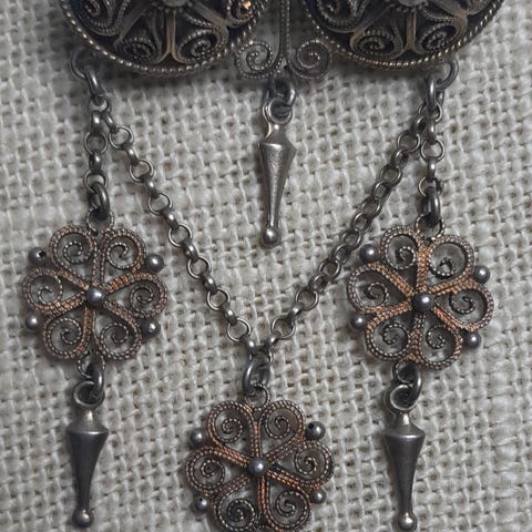 Pen eldre bysølje med emalje. 4 cm bred, ca 5 cm høy.