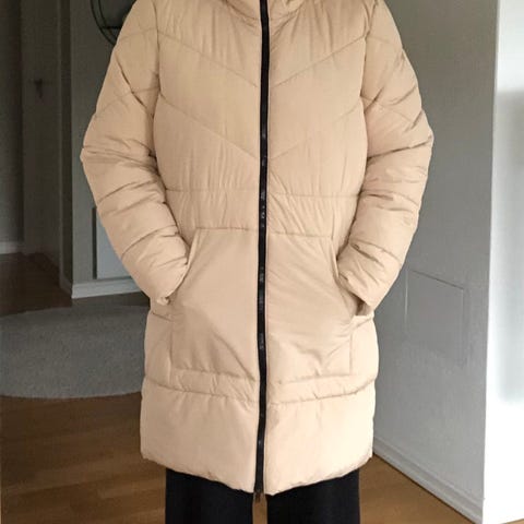 Vannavvisende boblejakke i størrelse XS. Den er brukt en sesong. Noe bruksmerker; glidelåsen på ene lommen har løsnet, så funker ikke nå (kan sikkert fikses hvis man prøver). Hempen inni jakken har falt av på ene siden (se bilde). Kan oppleve at dunen på armene har forskjøvet seg litt. Ellers utrolig god jakke. Passer også fint s/m.