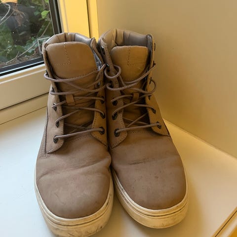 Sneakers fra Timberland i str. 41. Brukt få ganger, men har fått litt misfarging på gummien på tåa, og noen plasser på det hvite på sålen, se bilde.