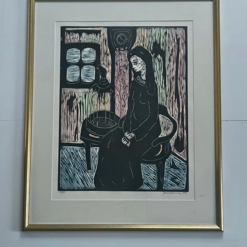 Plakattrykk av Kai Fjell, kvinne med fruktkurv pastell 50×68 cm. Signert med blyant og nummerert i ett opplag på 100 eks.