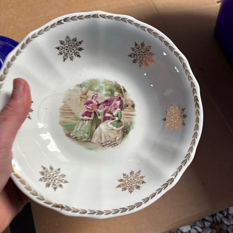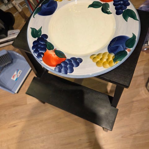 Arabia tallerken med dekorative historiske motiver. Tallerkenen har detaljerte illustrasjoner av personer i historiske klær, med fargerike omgivelser. Produktet er laget i Finland og fremstilt i keramisk materiale.