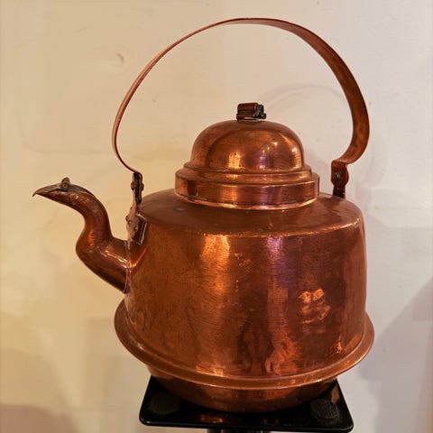 Dette er en klassisk kobberkjele brukt til koking av vann, mat eller brygging, typisk for husholdninger og gårdsbruk i eldre tid. Utførelsen med nagler, tykk kobberkvalitet, enkel form og fortinnet innside peker tydelig mot tradisjonelt håndverk.