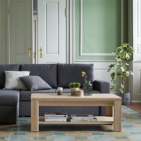 Jysk sofabord med bordplate i tre og ben i metall. Oval form med ekstra hylle under bordplaten for oppbevaring.