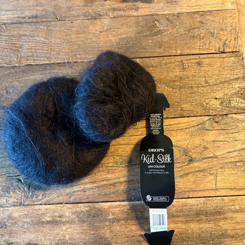 Drops Kid Silk garn i fargen 30, karri. Garnet består av en blanding av mohair og silke, egnet for strikking og hekling av lette og myke plagg og tilbehør.