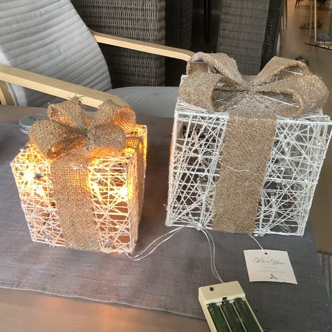 Dette er dekorative julegaveesker med LED-lys. De er laget av et hvitt tråd/garnlignende materiale.