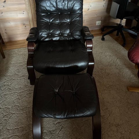 Skinnstolen er flott i front som er skinn. Under armlene er den sprukket noe i skaien, Stresslessen har polstret sete og rygg for komfort og en dreibar base i tre.