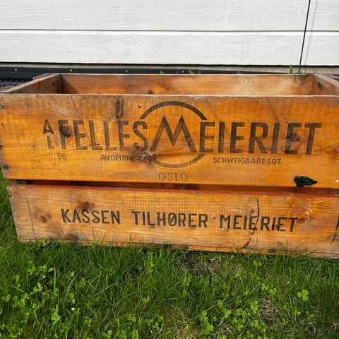 Kassen er merket “Margarinsentralen” og “Kunstsmult” (12 kg), og har flott originalt trykk og autentisk patina. Dimensjoner : 35x28x18 cm