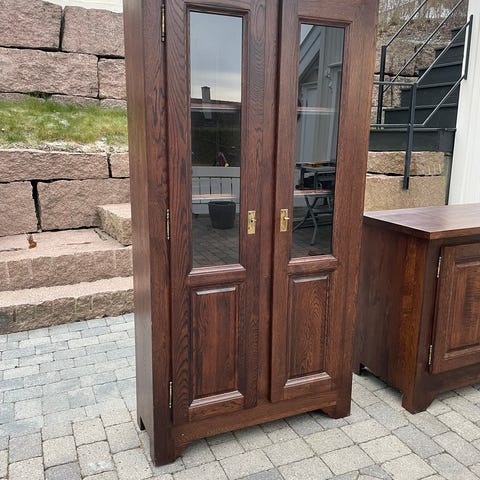 Billy seksjon bestående av to vitrineskap med glasshyller kr 600 pr stk, to hylle seksjoner kr 400 pr stk og to cd hyller kr 200 pr stk. samlet pris kr 2000,-. Selges fra dødsbo. Må hentes hos selger.