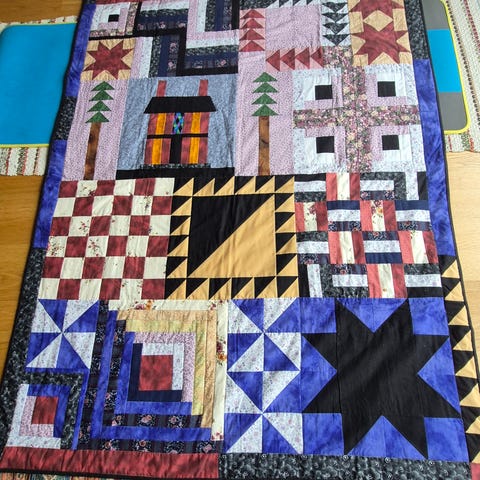 Tekstilbilde med motiv av fire landskap i forskjellige farger og mønstre. Teppet har en lys bakgrunn og detaljer i rødt, grønt, blått og beige. Materialet er bomullstekstil, egnet for bruk som pyntebilde eller teppe.