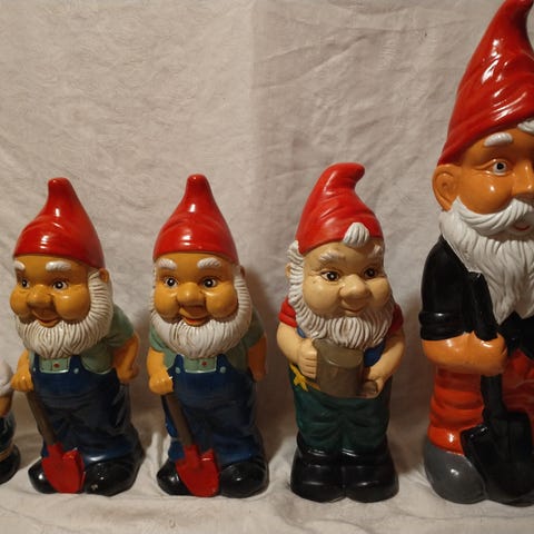 2 gamle nissefigurer selges samlet. Hele og fine. Ca 50 cm høye. Arvet. Ukjent alder. Muligens laget ved Moss Glassverk. Usikkert materiale, - trolig laget av gips eller leire. Selges høystbydende.