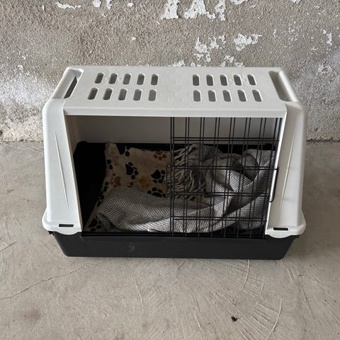 Grå hundehus med hvitt bjørnemønster, laget i stoffmateriale. Inkluderer en matchende pute. Veldig lita brukt. Størrelse B 75